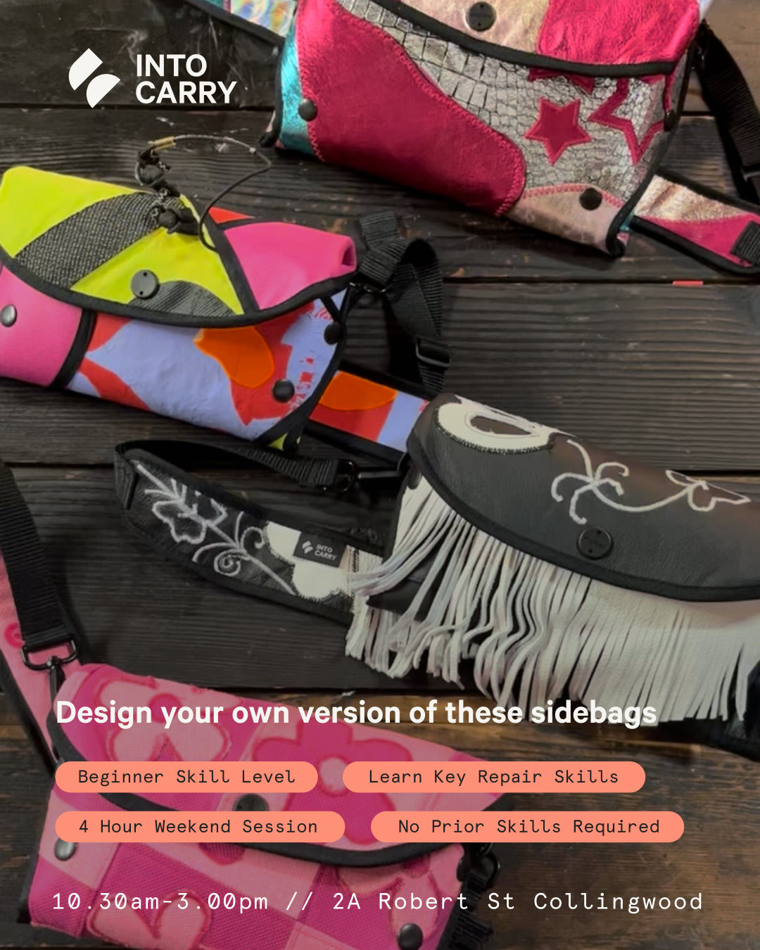 Join us for this beginner-friendly creative upcycling workshop, then walk the streets with your own custom designed Sidebag.