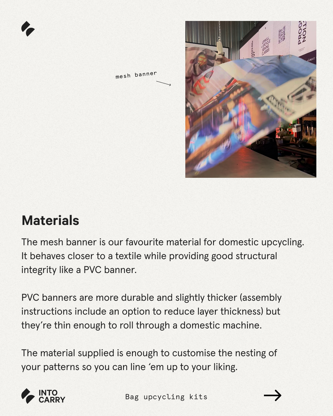 Make your own one of a kind upcycled bag from the worlds best upcycling materials: promotional banner. Save the hassle of sourcing premium waste materials with this custom designed bag making Kit.
