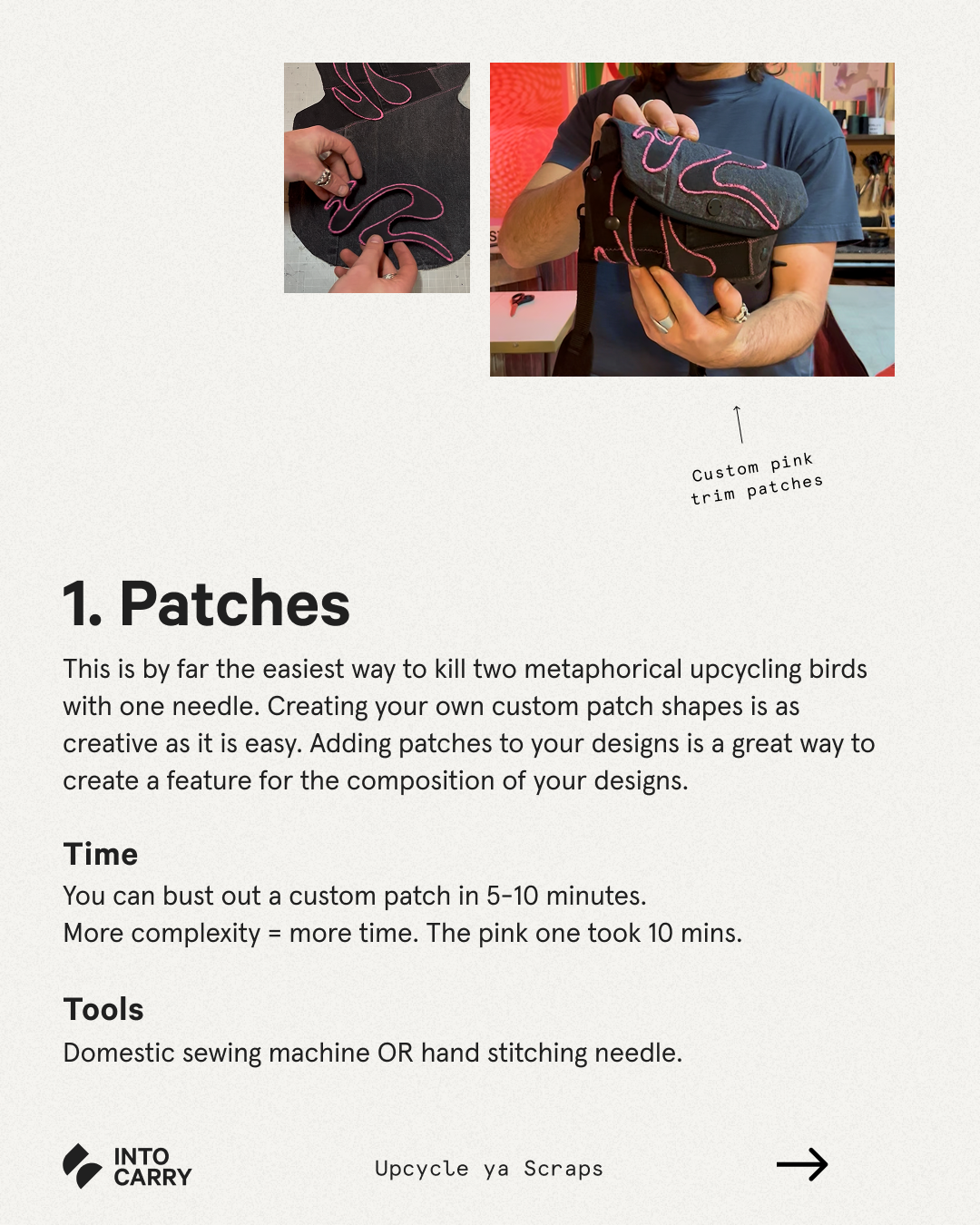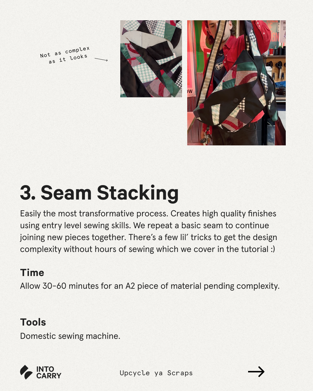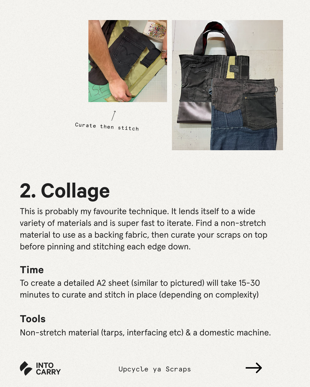 Practical tools to apply to a variety of projects: These three foundational techniques make their way into so many of our upcycling projects. Whether it's repairing your favourite pants or transforming your busted jacket into your new 'going out' handbag, these techniques are perfect for any sewing-based upcycling projects.